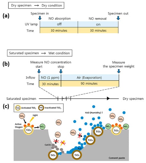 The TiO2-inclusive photocatalytic concrete was effective for NOx removal, which in turn resulted in a decrease in acidification, ecotoxicity, eutrophication, human health degradation factors, smog formation, and respiratory effects. Pollutant removal studies informed that white cement-based photocatalytic materials were superior for NOx removal than gray cement. A microscale thermal model was proposed to explain the UHI effect arising from white cement concrete overlays. The model suggested a five-fold reduction in global warming potential for white cement as compared to gray cement. Through the design of a small scale bed flow photoreactor, the photocatalytic performances of cement-based TiO2-containing materials were evaluated towards NOx reduction by monitoring the potential reaction products from the gas phase/aqueous extraction for various experimental conditions (relative humidity, flow rate, mixing ratio, and light intensity) [111]. The results revealed that the potential of the cement-based TiO2-containing materials towards photocatalytic remediation of NOx and conversion into nitrite through the analysis of reaction products at the surface. Under atmospheric conditions, the NO and NO2 uptake coefficients were determined in the range of 5 × 10−5 at a surface deposition velocity of about 0.5 cm/s. The NOx removal capacity of photocatalytic blocks of cement, based on mortars made with Portland cement, two different calcium aluminate types of cement, and air lime, and at least a few TiO2 additives (TiO2 as reference catalyst, and two doped titania, Fe-TiO2, and V-TiO2), was investigated [112]. A high NOx abatement (up to 60–80%) with good selectivity was observed for air lime and high alumina cement (HAC) mortar-based photocatalytic cement under the three illumination conditions (UV, solar, and visible light). Lime and HAC mortars exhibited the best NOx abatement percentages under the three irradiation conditions (UV, solar and visible lights). The NOx removal efficiency was explained through the combined influence arising from the presence of higher amounts of calcium carbonate and the probable reaction of the final photo-degradation product of NOx, namely nitric acid. The additional role of visible light photo-degradation was proven by the increase in NO removal percentages of the mortars with the doped additives (Fe-TiO2 and V-TiO2). Among the doped TiO2 samples, Fe-TiO2 was most effective for NOx removal. Dawa Seo and Tae Sup Yun compared the nitrogen monoxide (NO) removal capacity of TiO2-inclusive cementitious materials between wet and dry conditions [113]. An experimental design was made as shown in Figure 3a,b. The wetting of the photocatalytic cement-based materials and the wetting condition play critical roles in achieving a reasonable NO removal rate and also to understand practical sustainability against air pollution. The water molecules were present near TiO2 particles, and the wetting altogether influenced the photocatalytic reactions (Figure 3c). The increase in humidity and the rewetting of TiO2 occurred through the continuous evaporation of vaporized water molecules from pores.