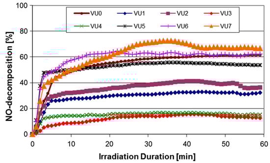 Average degradation efficiencies of NO for all studied specimens [119]. Eight TiO2 products (VU0 to VU7) with varying grain size, anatase proportions, and surface area. VU0 is the reference commercial cement mixture.