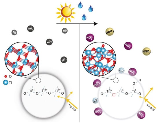 Truffier-Boutry et al. developed macro-sized and nano-sized TiO2-inclusive paints and studied their photocatalytic, microstructural, and morphological abilities in the process of understanding their environmental impacts [123]. Their main focus was to understand the main parameters that could control the expulsion of nano-sized particles from nano-TiO2 and to bring out safer formulations of paints having salient characteristics, such as less inclusion of nano-sized photocatalytic particles with minimal VOC-releasing possibility. The crucial conclusions derived through the study include that paints formulated with TiO2 particles having sizes smaller than 100 nm with rutile crystalline structures exhibited the capacity to remove air pollutants. On the other hand, xylene removal capability was observed for the paint formulation consisting of TiO2 NPs. Audrey Bonnefond et al. formulated photocatalytic paints containing two types of polymeric binders [124] (a pure (meth)acrylic latex (LM1), and a fluorinated/(meth)acrylic latex (CS2) with core-shell morphology) along with two types of TiO2 NPs (Degussa P25 and Johnson and Matthey (JM) sample) [125]. The substrate film-based paint was superior compared to air film because of the higher availability of interfaces at the bottom of the film for the former paint system. Riccardo Paolini et al. discussed the possible adverse effects of the solar reflectance of TiO2-containing materials. An elaborate mechanism to explain the cause for the partial reduction in and decreased crystallinity of TiO2 was proposed based on the contact with nitric acid generated by NOx photocatalytic degradation [126]. Upon light irradiation onto the TiO2 surface in a humid environment, NOx was converted into NO which in turn hydrolyzed to HNO3. The adsorption of nitrates could occur on the protonated TiO2 surface arising from the acidic environment, causing an increase in oxide defect density and a decrease in crystallinity, or an increase in amorphous characteristics. The proposed mechanism (Figure 6) presents explanations for the variation of the optical behavior of TiO2 in terms of changes in morphology, surface area increase, surface defects, chemical structural changes (hydroxylation, protonation), adsorption, etc. [127].