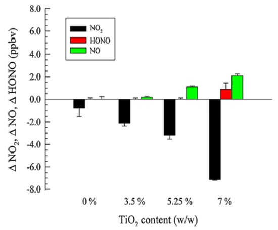 Adrien Gandolfo et al. developed different quantities of TiO2 NP-inclusive photocatalytic paints and investigated the optimization of conditions for NOx remediation and HONO formation. The photoactivity of the developed paints was tested under a UV light in an indoor condition. The results revealed that the photocatalytic paints substantially decreased the NO2 concentration [129]. The photocatalytic paints including 0.3% to 7% TiO2 NPs were studied using a horizontal flow tube reactor. The NO2 uptake showed an increasing trend concerning TiO2 loading for the photocatalytic paint with a loading of up to 7% TiO2 NPs. Notably, the photocatalytic paint loaded with 7% TiO2 efficiently eliminated the majority of gas-phase NO2, converting it to NO and HONO (Figure 8). Notably, the NO conversion rate increased with the increase in TiO2 NP content. Gas-phase HONO was predominantly formed for paint including 7% TiO2 NPs.