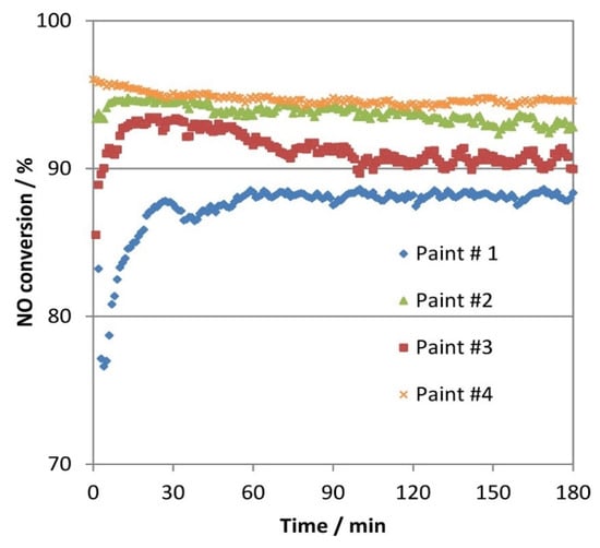 A dynamic mass-balance model was proposed to predict the time-based formation of HONO in a real indoor condition. The photo-efficiency of four kinds of TiO2 coatings along with the influence of a SiO2 interlayer was investigated on NOx photo-degradation [130]. Three types of commercial TiO2 suspensions and a home-made Titania sol-gel were used, and a SiO2 layer was formed on the cement surface. The coating of the SiO2 layer in between the mortar and the commercial TiO2 coatings could not stabilize the TiO2 NPs. On the other hand, the homemade TiO2 NPs were stabilized through excellent adhesion arising from the probable interactions between SiO2 and TiO2 sols. Joana Ângelo et al. evaluated outdoor NOx abatement using photocatalytic paints incorporated with commercial TiO2 (Figure 9) [131]. Commercial samples of P25 from Evonik and PC500 from Cristal were utilized for developing exterior water-based paints. The standard ISO 22197-1:2007 protocol was used to evaluate the photocatalytic NOx degradation performance of these four paints. Upon performing outdoor tests, the developed paints showed a higher NO conversion rate (more than 80%). To quote correctly, the paint comprised of PC500 and calcium carbonate exhibited the highest NO conversion of ~95%.