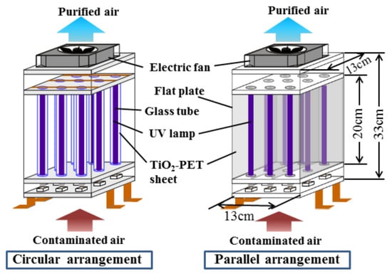 - Shiraishi, F.; Maruoka, D.; Tanoue, Y. A better UV light and TiO2-PET sheet arrangement for enhancing photocatalytic decomposition of volatile organic compounds. Sep. Purif. Technol. 2017, 175, 185–193. [Google Scholar] [CrossRef]