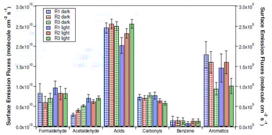 Surface emission fluxes (molecule cm−2 s−1) obtained for selected VOCs (formaldehyde, acetaldehyde, acids, carbonyls, aromatics, and benzene) under “dark” conditions (lozenge) and in the presence of a UV light (solid) [175].