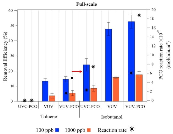 A reactor comprising of a gas pump and pipes was set up to understand the degradation kinetics using Fourier-transform infrared spectroscopy. The research paper reported comparative data on the photocatalytic isopropanol oxidation between simulated solar light and UV irradiation as well as pristine TiO2 and rare earth element-doped TiO2. Birte Mull et al. developed pure TiO2 or TiO2 modified with graphene oxide (GO)-inclusive photocatalysts and investigated the photocatalytic degradation of a few of VOCs (butyl acetate, toluene, and limonene) under UV LED (light emitting diodes)/blue LED light irradiation conditions [176]. Based on irradiation experiments, they inferred that the modified TiO2 samples with trace amounts of GO (0.75–5%) showed better photocatalytic performance under blue light. However, photocatalysts loaded with a higher value of GO (10% or higher) caused adverse photoactivity both under UV and blue light irradiation conditions. Zahra Shayegan et al. investigated the three levels (bench-scale, pilot, and full) of scaling effects on the removal efficiency of toluene and isobutanol removal efficiency as well as the generated by-product by evaluating the UV-irradiated photocatalytic oxidation performance using a commercial TiO2 photocatalyst (Figure 12) [177]. Based on the factor θ (mg VOCs/g photocatalyst media), a comparison between the three scales (full, pilot, and bench) was made on the gravimetric (per mass) pollutant removal efficiency for toluene and isobutanol in terms of the flow rate of pollutants and the weight of the photocatalyst. Conditions such as residence time, flow rate, and humidity were optimized to derive extrapolated information for real indoor application. Full-scale studies showed that toluene could not be effectively removed in UV-assisted PCO due to the higher velocity of flowing gas and lower light distribution. However, studies performed with 100 ppb and 1000 ppb concentrations of isobutanol showed a 24.1% and 8.6% removal efficiency, respectively (Figure 12).