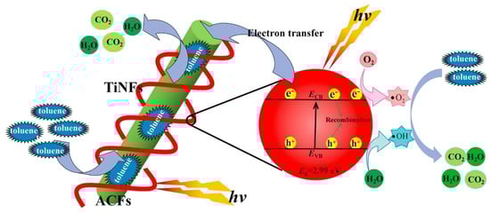 Alireza Haghighat Mamaghani et al. presented a comprehensive overview of commercial TiO2 photocatalyst-based VOC removal in air [14]. Enhanced photocatalytic activity could be achieved through fine-tuning physical properties (crystallinity, crystal size, anatase and rutile phase compositions, and porosity) and surface properties (amount of surface hydroxyl groups, surface area, and surface density) of the TiO2. The role of support materials, such as activated carbon, on the adsorption and removal efficiency of VOC was detailed. Ming-Jun Tian et al. prepared a porous photocatalyst composite comprised of ultralong TiO2 nanofibers (TiNF) distributed in activated carbon fiber (ACF) (TiNF/ACF) porous composites by the depositing TiNFs within ACF felts, the support matrix [178]. They observed improved photocatalytic performance for toluene removal because of synergetic effects arising from the interaction between the TiNFs and ACFs (Figure 13). A mechanism for efficient photocatalytic activity was suggested. ACFs play multiple roles, such as hindering the recombination of electron–hole pairs, enhancing the light adsorption ability by reducing the TiO2 bandgap energy (Eg) to 2.99 eV, and increasing the quantum efficiency of TiO2. Typically, a high surface area and macroporous structure of composite photocatalysts could result in higher adsorption efficiencies (98.9%) for a toluene concentration of <4600 ppm. Zhuowei Cheng et al. used a combined sol-gel hydrothermal methodology for the preparation of La/N-TiO2 nanotubes [179] and evaluated photocatalytic activity towards chlorobenzene. A greater surface area and smaller particle sizes were produced with the co-doped TiO2 nanotubes. The relative humidity of the system played a role in the conversion of chlorobenzene. A probable mechanism involving a water molecule for the photocatalytic chlorobenzene conversion is presented.