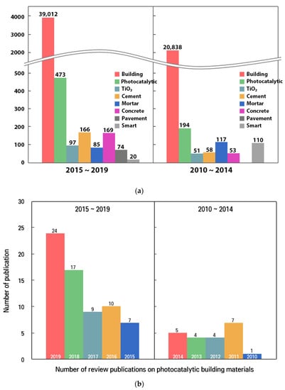 (a) Several contributions published annually from 2010 to 2019 on TiO2-based photocatalytic materials in various sub-topics and (b) Number of published review articles annually from 2010 to 2019 for TiO2-based photocatalytic building materials.