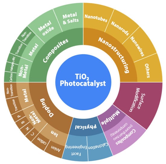 TiO2 is one of the popular commercial photocatalysts which is prevalently used for the photo-degradation of many pollutants. TiO2 offers major advantageous characteristics, such as ease of synthesis and versatility of application. TiO2-based photocatalysis has proven to be a very promising advanced oxidation process for the depollution and cleaning of indoor and outdoor air, exhibiting unique advantages over conventional remediation technologies. Through a significant number of research studies, the unique photocatalytic properties of TiO2 structures, or the phase compositions that facilitate the oxidation of nitrogen oxide (NO) to nitrogen dioxide (NO2) and then to nitric acid (HNO3), as well as the conversion of VOCs to CO2 and H2O under ultraviolet (UV) irradiation, have been well documented. Continuous research activities are being directed towards improving the photocatalytic efficiency of TiO2 via preparation of nanostructured TiO2, doping with non-metal (C, N, S, and I) and metal ions (Cr, Mn, Fe, and Ni), preparation of different polymorphs and their mixtures, composite formation, etc. (Scheme 1). The commonly known anatase and rutile forms of TiO2 belong to the large bandgap semiconductors with bandgap energies of 3.2 and 3.0 eV, respectively [45]. However, chemical/structural modifications of TiO2 can result in the decrease in the bandgap in such a way that TiO2 could be effectively used for the transformation/degradation of environmental pollutants/contaminants under solar or visible light irradiation.
