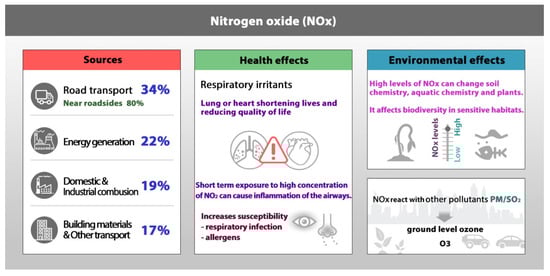 NOx is generally a collective term that represents two distinct gases, namely NO, or nitric oxide, and NO2, or nitrogen dioxide, and the gradual oxidation of NO results in nitric acid and NO2. Nitrous acid is a possible intermediate during the transformation of NO to NO2. It is to be mentioned that intermediates are more harmful than the primary reactants, NO and NO2 [98]. Specifically, NO2 is three times more toxic than NO, the primary pollutant [99]. NO2 can function as a precursor for the generation of even more toxic atmospheric constituents, such as ozone and peroxyacyl nitrates. In addition, NOx can interact with other primary pollutants, such as PM or SOx (sulfur dioxide and sulfur trioxide), and can generate other problems, such as ozone, acid rain formation, etc. Thus, NOx emission forms the basis of formulating environmental regulations, especially in the ozone non-attainment areas. NOx pollutants are introduced into the ecosystem through natural (extreme heat of lightning), biogenic (fertilization and the use of nitrogen-fixing plants), and industrial (thermal natural combustion, fuel combustion, and prompt process) sources. The probable sources of NOx and the health issues arising from short-term and long-term exposure are presented in Scheme 4. Due to the environmental damage caused by NOx gases, many regulations were designed to limit their emissions. The emission regulations vary from country to country in type and extent. The concentration limit for NOx to cause pollution in ambient air as per the European directive is 40 g·m−3 (0.021 ppmv) averaged over one year and 200 g·m−3 (0.106 ppmv) averaged over 1 h (Directive 2008/50/EC, 2008) [100]. Likewise, the NOx concentration limits fixed by other authorities, such as WHO, the U.S. Environmental Protection Agency, the Ministry of Environmental Protection of China, and the Australian Department of the Environment and Energy, are similar.