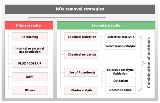 Common strategies (primary and secondary) employed for NOx removal. (FLOX: flameless oxidation; COSTAIR: continuous staged air combustion; GAFT: gas-dynamic abated flame temperature).