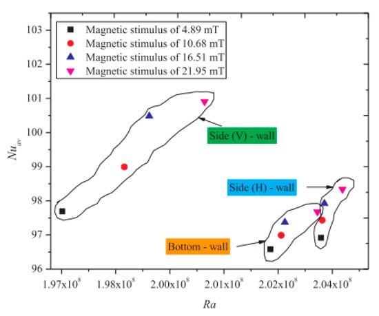 | Yamaguchi et al. [154] | Mg-Zn ferrite/alkyl-naphthalene | Cubic with a magnetic field. | Ra (3.0 × 103–8.0 × 103), Ram (1.0 × 108–1.25 × 108) | - | 2-step (-) | Heat transfer is enhanced on exposure to magnetic field. An increase in the magnetic strength enhanced heat transfer further. |