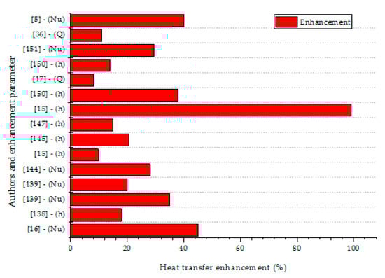 | Dixit and Pattamatta [143] | SiO2/DW, MWCNT/DW, Graphene/DW, and Cu/DW (0.057, 1, and 2 vol.%) | Cubic (25 × 50 × 50 mm3) + magnetic field (0.13 T and 0.3 T) | 1 × 106–1 × 107 | μ and κ | 2-step (ZP) | Heat transfer is augmented for all the graphene samples and MWCNT at 0.1 vol.%, without magnetic field. Generally, heat transfer in all the NF samples is deteriorated with magnetic field. |