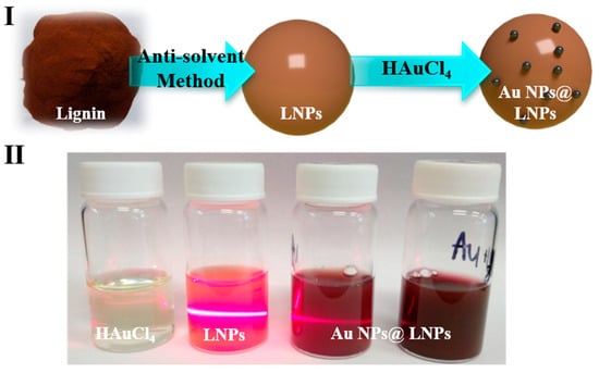 Lignin, the most abundant aromatic, is a biopolymer derived from trees and crops []. It is a three-dimensional amorphous polyphenol which consists of methoxylated phenylpropane substructures. Nowadays, millions of tons of industrial lignin are obtained from pulp mills; however, the lignin is normally used as fuel during the pulping process which is a rather inefficient way to utilize the lignin []. Extensive studies are devoted to exploit value-added applications, such as cosmetics, water treatment, adhesive, soil treatment, food, and medicine, etc. [,]. In the past decade, researchers found that the 3D structure and abundant surface groups (hydroxyl, carbonyl, and aldehyde groups) could act as reducing and stabilizing agents for the green synthesis of metal nanoparticles. Various approaches were applied in the green synthesis of metal nanoparticles including microwave irradiation, mechanical grinding method, and heat reduction. Han et al. reported Au NP-loaded liquid marble using lignin as a reducing agent under microwave radiation at 80 °C for 60 min []. The liquid marble exhibited excellent properties for the detection of Hg2+ and photothermal conversion. Lin et al. reported the green synthesis of Au NPs with the addition of hemicellulose/lignin at 100 °C []. With the development of material science, the regular structure of nanomaterials is essential to the design of functional materials for advanced applications. Moreover, the recent progress in the preparation of lignin nanoparticles (LNPs) inspired the design of lignin-based functional materials [,,]. Thus, the green synthesis of well-dispersed Au NPs with LNPs is important for the preparation of composite lignin-derived materials.