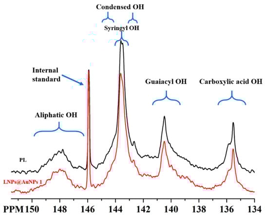 The green synthesis of Au NPs was related to the surface functional groups of the lignin; thus, it is essential to analyze the chemical structure of the lignin. The chemical structure of the lignin was characterized with FTIR and 31P spectra. Figure 2 shows the 31P spectrum of the PL. The main OH groups (syringyl and guaiacyl –OH) were observed in the PL which is the typical structure of lignin. The total –OH, noncondensed phenolic –OH and carboxylic acid contained 24.96, 14.47 and 2.34 mmol g−1 lignin, respectively (Table 1). After the reduction process, the content of the aliphatic and phenolic hydroxyl groups decreased, and the content of the carboxylic groups increased. The results indicated the reduction process may be related to the oxidation of hydroxyl groups. The abundant noncondensed phenolic hydroxyl groups favored the preparation of Au NPs.