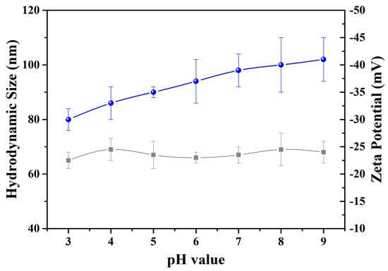 Variation of hydrodynamic size and zeta potential of LNPs with different pH values.