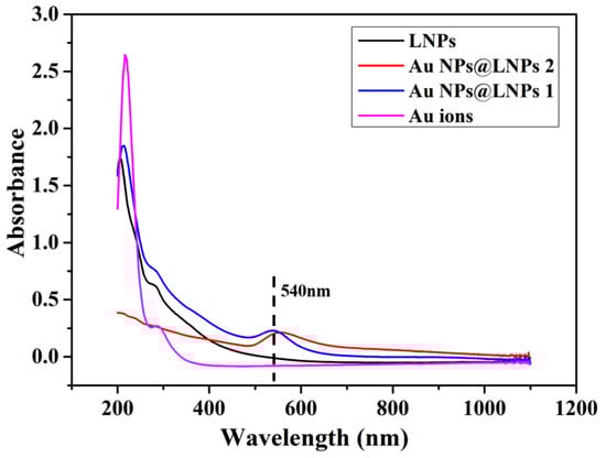 UV-Vis spectra of the LNPs, Au ions and LNPs@AuNPs.