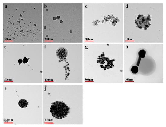 The Au NPs were synthesized in situ by using the hydroxyl and aldehyde groups of the LNPs. Figure 7c,d shows the morphology of the LNPs@AuNPs. The diameter of the gold nanoparticles was in the range of 5–30 nm. The well-defined structure of the LNPs and well-dispersed gold nanoparticles verified that LNPs could act as excellent reducing agents and capping agents for the preparation of gold nanoparticles. Figure 7e,f demonstrates that the increased HAuCl4 concentration led to decreased average gold nanoparticles. However, the increased HAuCl4 concentration resulted in the collapse of the hollow structure of LNPs. Part of gold nanoparticles are from the LNPs. Thus, a moderate HAuCl4 concentration should be controlled. Figure 7g,h indicates the Au NPs prepared at 80 °C for 30 min. The increased temperature led to the inferior control of the growth of gold nanoparticles. Furthermore, the Au NPs@ LNP composites exhibited excellent dispersal ability after storage for seven days (Figure 7i,j). These results verified that well-dispersed gold nanoparticles with well-defined lignin nanoparticles could be prepared at room temperature with the concentration of HAuCl4 at 0.5 mmol/L.