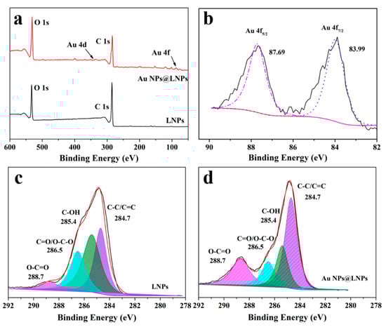 XPS wide scans showed the signals of carbon and oxygen (Figure 8a). The LNPs@AuNPs exhibited the signals of Au which further confirmed the successful preparation of gold nanoparticles (Figure 8b). The C 1s spectra of LNPs and LNPs@AuNPs with their deconvolutions are shown in Figure 8c,d, respectively. The deconvolution of LNPs and LNPs@AuNPs on C 1s shows four similar peaks: peak 1 with binding energy 284.7 eV is related to a carbon bound to carbon atoms (C–C) or carbon–carbon double bond (C=C), peak 2 at 286.5 eV corresponds to a carbon atom bound to a non-carbonyl oxygen atom (C–OH), peak 3 at 285.4 eV represents a carbon atom bound to one carbonyl oxygen atom (C=O) or two non-carbonyl oxygen atoms (O–C–O), and peak 4 at 288.6 eV corresponds to peaks for O–C=O. Compared with the LNPs, the bands signal of C=O and O-C=O are stronger, while the signal of C–O decreased obviously. Thus, the side chain of lignin was disrupted during the reduction process, and the quinone structure or carboxylic groups were formed [].