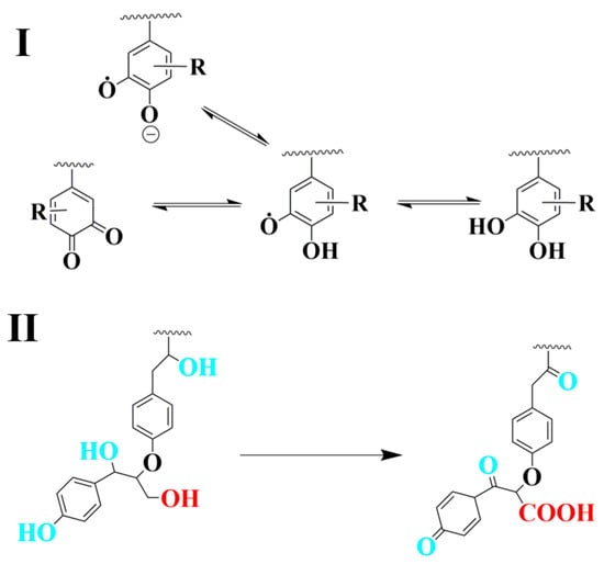 Lignin contains stable radicals at room temperature. The main radicals have a semi-quinone structure []. During the reduction process, the hydroquinones and quinone structure of lignin formed due to the comproportionation reaction of semiquinone radicals, and semiquinone radical anions might be related to the formation of gold nanoparticles (Figure 9I). Also, the abundant phenolic groups favor the reduction of Au NPs. The surface hydroxyl groups would be transferred to carbonyl/carboxylic groups which contribute to the preparation of Au NPs (Figure 9II).