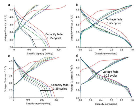 - Bettge, M.; Li, Y.; Gallagher, K.; Zhu, Y.; Wu, Q.; Lu, W.; Bloom, I.; Abraham, D.P. Voltage Fade of Layered Oxides: Its Measurement and Impact on Energy Density. J. Electrochem. Soc. 2013, 160, A2046–A2055. [Google Scholar] [CrossRef]
