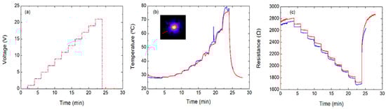The same procedure was followed for the characterization of the double-layer CNT heaters. In that case, the initial resistance of the two-layer heater was about 700 Ω, which corresponds to a value 3 times lower than the obtained for the single layer heater, as it was expected by increasing the number of CNT layers [27]. First, a voltage sweep from 0 V to 18.5 V with 0.5 V steps every 1 min was applied to the sample, as observed in Figure 6.
