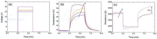 Characterization, applying different voltage levels (20 V, 21 V, 22 V, and 25 V): (a) voltage over time, (b) temperature over time, and (c) resistance over time (the arrow shows the increase in the voltage).