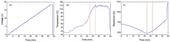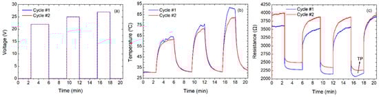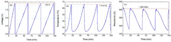 Characterization, applying voltage up to 9.5 V, for consecutive cycles: (a) voltage over time, (b) temperature over time, and (c) resistance over time.