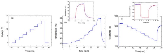 Sweeps up to 16 V after transition point. Characterization, applying voltage up to 16 V (after reaching the transition point): (a) voltage over time, (b) temperature over time, and (c) resistance over time. Insets correspond to the characterization, performed applying two steps at 16 V.