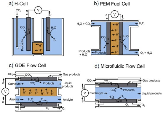 To date, electrochemical reduction of CO2 has been demonstrated by systems operating under ambient conditions (H-cell, flow cells, membrane-electrode-assembly (MEA) cells) or under high temperatures such as solid oxide electrolysis cells (SOECs) [17,18,19,20]. Figure 1 illustrates configurations of different reactor designs commonly used for the electrochemical reduction of CO2 [19]. CO2 can be flowed into the cathodic compartment, either via dissolution in electrolyte or as humidified gas in a MEA cell. A gas diffusion electrode flow cell has the catholyte and anolyte separated via an ion exchange membrane, while a microfluidic flow cell only has a single electrolyte flowing between anode and cathode. The performance of electrochemical CO2 reduction is commonly studied by the following parameters [19]: