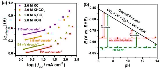 The majority of literature has reported overpotential as a total contribution from the system when studying performance of catalysts. However, it should be noted that overpotential is a sum of the activation overpotential from the performance of a catalyst, the concentration overpotential, and resistance overpotential [59,60,61]. The movement of ions in the electrochemical cell is controlled by migration, convection, and diffusion. Ions migrate toward the electrolyte-electrode interface and form a double layer of concentrated ions which acts as a concentration barrier. The extra energy required for the movement of the ions to and through this double layer is the concentration overpotential. Resistance overpotential is generally regarded as the potential drop of ohmic loss from cathode. Since additional energy must be supplied to activate the ions discharged at the required rate to promote flow of current, CO2 reduction with two protons transfer processes for CO and formate is typically found to have lower overpotentials compared to other hydrocarbons and oxygenates products [62]. Therefore, reduction of overpotential should solve for improvement of catalyst performance, optimization of the electrolyte-electrode interface, and strategies to enhance the conductivities of the cathode and electrolyte.