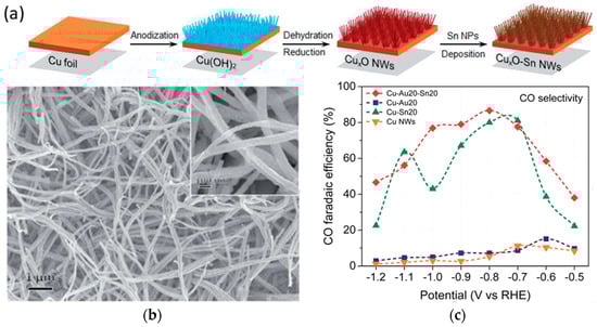 Thermal oxidation of smooth Cu foam surfaces followed by reduction results in the formation of Cu nanowires and a significant increase in the active surface area. Raciti et al. [116] described a two-step thermal oxidation/reduction method to treat commercial Cu mesh for electrochemical CO2 reduction. Thermal oxidation of Cu mesh at 600 °C in air for 8 h resulted in growth of dense CuO nanowires. Metallic Cu nanowires were obtained through a subsequent reduction by either annealing in H2 or cathodic treatment. The Cu nanowires obtained through cathodic reduction showed substantial improvement in terms of high FE at low overpotentials for CO generation (i.e., 60% FE at 0.4 V and 1 mA cm−2) in comparison with oxide-derived and polycrystalline Cu.