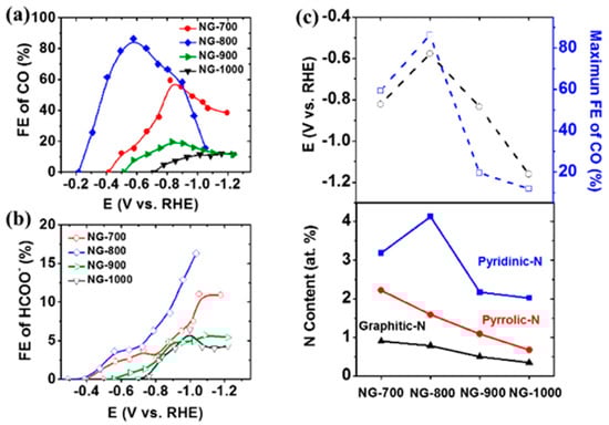 Nitrogen and other heteroatoms can take multiple configurations in a carbon network. These include graphitic N, pyrrolic N, pyridinic N and oxidized pyridinic N (N-oxide) [133]. Figure 3 schematically shows these configurations. Density functional theory (DFT) calculations and experimental work show that pyridinic N is the most active configuration that offers the lowest free energy barrier for adsorbed COOH* formation among other N configurations [135]. This is due to the high energy of dangling N bonds leading to strong adsorption of the COOH* intermediate [136].
