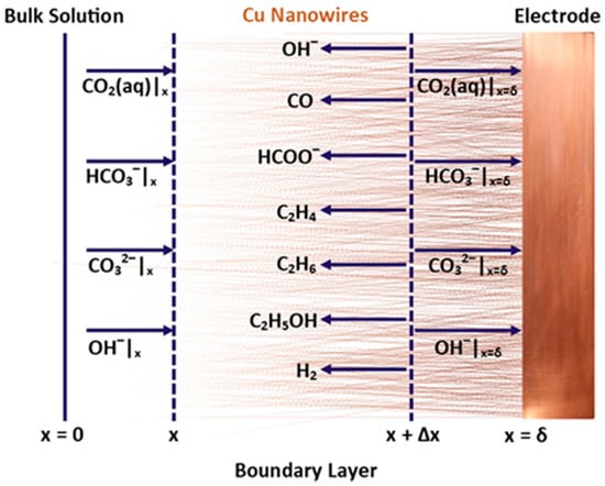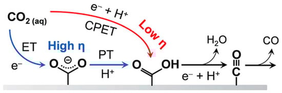 Copper is an active electrocatalyst for direct reduction of CO2 to alcohols and hydrocarbons in aqueous solutions. Depending on the electrolyte pH and other operating conditions, CO2 is first reduced at a certain cathodic potential to CO, which is weakly adsorbed on the Cu surface [125]. At more cathodic (negative) overpotentials, the adsorbed CO is further reduced to alcohols and hydrocarbons [125]. Copper is also the only transition metal known to produce C2+ products from CO2. However, Cu is not selective for a specific type of product and CO2 is reduced to a mixture of chemicals that need to be separated [126]. In addition, Cu is prone to poisoning, restructuring, and loss of activity [121].