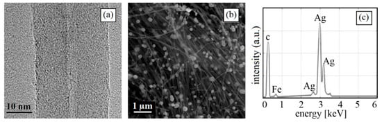 Figure 2c depicts the elemental analysis of MWCNTs by the EDX technique. This analysis highlights the presence of carbon corresponding to MWCNT structure and iron appropriate of the synthesis process. There is also a notable presence of Ag NPs in the composition of the samples due to decoration process.