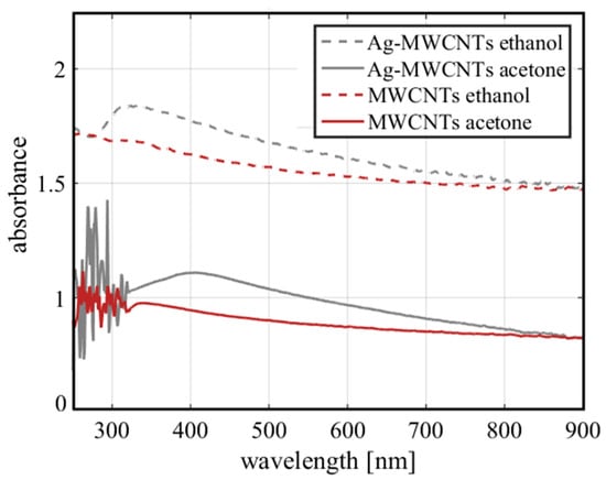The UV-VIS absorption spectra of the samples prepared in ethanol and acetone with Ag-MWCNTs respectively are plotted in Figure 3.