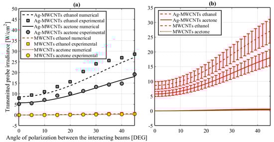 Figure 4b corresponds to the error bar of the measurements associated with the transmitted probe irradiance as a function of the relative angle between the plane of polarization of the incident beams in the samples. These bars exhibit an error of approximately ±15%. From the absence of an overlapping in the experimental data for the Ag-MWCNTs in acetone and ethanol and the MWCNTs can be guaranteed the clear signature of the different studied samples in this TWM experiment.