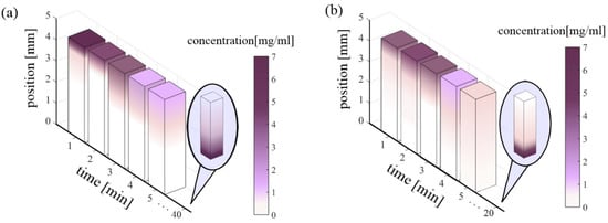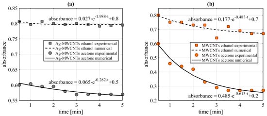 The spatial distribution of molecules in a nanofluid is not homogeneous; this implies that there is a concentration gradient between two points in the medium. The diffusion phenomenon describes the concentration gradients with respect to time in the fluid. The concentration at the position of the particles in the medium at each instant of time obtained from Equation (4) is represented in Figure 6. The diffusion coefficient approximation was calculated from Equation (5) with ΨEthanol = 1.5, ΨAcetone = 1, MEthanol = 46.07 g/mol, MAcetone = 58.08 g/mol, ϒEthanol = 1.074 mPa·s, ϒEthanol = 0.32 mPa·s and νCarbon = 4.58 cm3/mol. The diffusion coefficient for carbon-acetone is 3 × 10−13 cm2/s and that for carbon-ethanol is 9 × 10−14 cm2/s. Time-dependence stability of the Ag-MWCNTs nanofluids strongly depends on the diffusion coefficient between the CNTs suspended and the ethanol or acetone solvents. The diffusion coefficient indicates an inverse relation in respect to the stability of the fluid. In order to verify the law of conservation of matter and energy in the diffusivity analysis, the area under the diffusivity curves was analyzed.