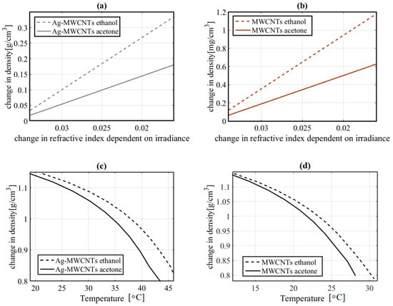Numerical results of the induced change in density estimated by considering the change in refractive index in the nanofluids. (a) Ag-MWCNT samples, (b) MWCNT samples. Numerical results of the induced change in temperature estimated by the change in density in the nanofluids. (c) Ag-MWCNT samples, (d) MWCNT samples.