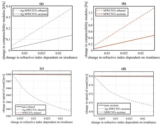 Numerical results of the induced change in compressibility modulus estimated by considering the experimental optical Kerr effect (OKE) in the nanofluids. (a) Ag-MWCNT samples, (b) MWCNT samples. (c) Change in the speed of sound due to Ag-MWCNT suspensions. (d) Change in the speed of sound due to MWCNT suspensions.