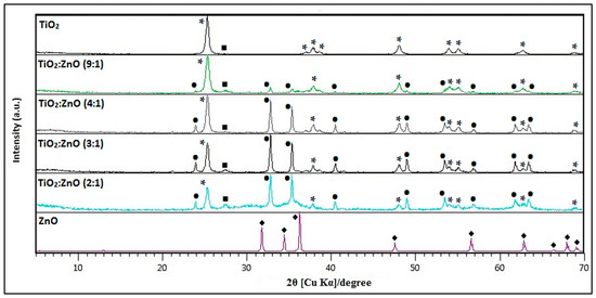 Synthesis using the sol-gel method of coupled ZnO-TiO2 [18] can generate some Ti-Zn mixed oxides, such as Zn2TiO4, Zn2Ti3O8, and ZnTiO3, among the main derived products [19,20]. Some impurity phases can also appear in the final products [21,22]. During the synthesis, the transformation of the crystalline phases presents different products, which depend on the initial molar ratio of the reactants and the calcination temperatures. The presence of anatase and rutile can also affect the behavior of the phases [23].