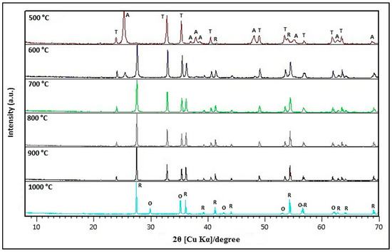 XRD of ZnxTiOy-TiO2−a synthesized to different temperatures. T: ZnTiO3; A: TiO2−a; R: TiO2−r; O: Zn2TiO4.
