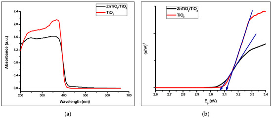 The optical absorption properties of photocatalysts can be characterized using the UV-visible (UV-vis) DRS in the range of 200–700 nm and at room temperature. Figure 5a shows the UV-vis XRD of ZnTiO3/TiO2 and TiO2. Compared to TiO2, the visible light absorption intensity of ZnTiO3/TiO2, at around 400 nm, was improved, suggesting that the ZnTiO3/TiO2 composite has a better response to visible light. The graphs of (αhv)2 versus hv for calculating the direct band-gap energy (Eg) are shown in Figure 5b. According to Equation (2) [42], the direct Eg values were 3.07 and 3.12 eV for ZnTiO3/TiO2 and TiO2, respectively. The direct Eg value calculated for ZnTiO3/TiO2 can be related to the direct band gap of hexagonal or cubic ZnTiO3 compound [43].