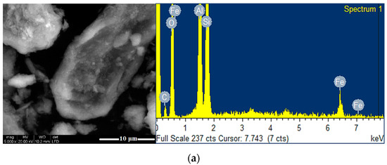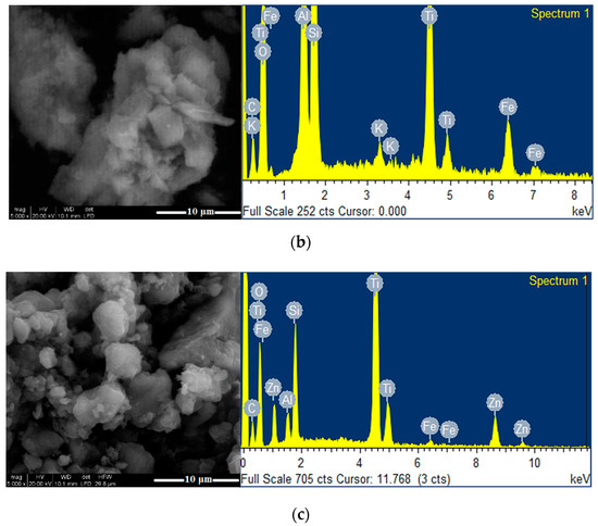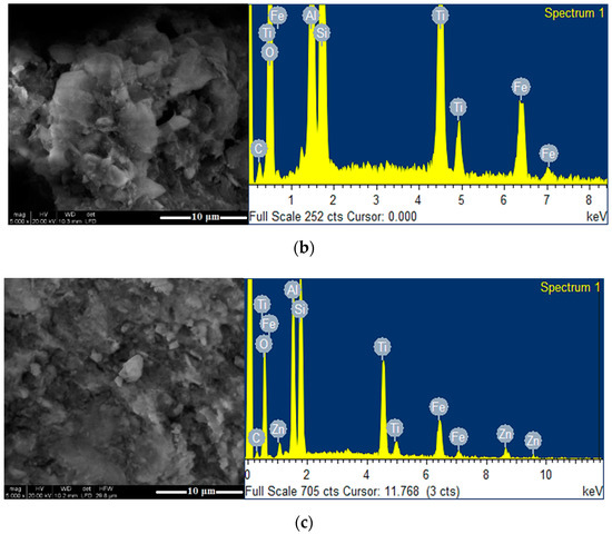 SEM images and EDX spectra of: (a) Clay6; (b) TiO2-Clay6; (c) ZnTiO3/TiO2-Clay6.