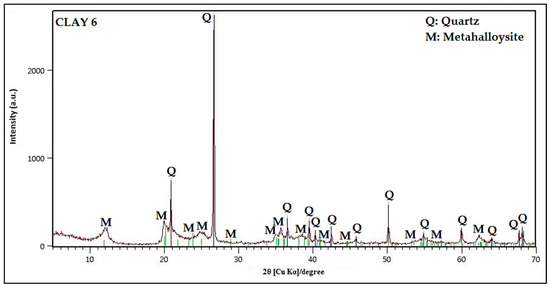 In Figure 11, Clay6 shows the highest MB removal capacity. The XRD pattern in Figure 12 shows that Clay6 consists mainly of Metahalloysite (M) and Quartz (Q), which could also contribute to the high adsorption capacity of the clay. This clay has a specific surface area of 42.8 m2/g, which was calculated from N2 gas adsorption using the Brunauer–Emmet–Teller (BET) isotherm in the Chemisorb 2720 equipment coupled to TPx.