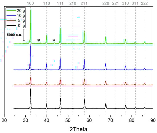 X-ray diffraction (XRD) patterns of the powders were recorded with a Malvern Panalytical X’Pert Pro (Malvern, UK) equipped with an X’Celerator detector powder diffractometer using Cu K radiation generated at 45 kV and 40 mA. The 2 range was from 25° to 100°, with a step size of 0.01° and a counting time of 0.6 s.