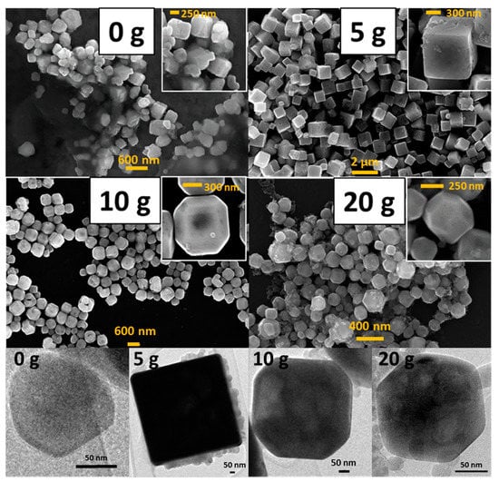 The synthesized materials were characterized by electron microscopy in order to study the effect of the PEG on their morphology. Figure 3 highlights the strong effect of PEG as the capping agent. Starting from a material without any defined morphology (SrTIT-0 g) and a primary particle size of about 200 nm, the lowest PEG concentration tested induces a remarkable change in both size and shape. The material SrTIT-5 g presents a well-defined cubic shape, but also a significant increase in the size (roughly >500 nm). The cubic shape is compatible with the presence of the most stable {001} surfaces for SrTiO3 [30,31]. Doubling the PEG amount, the cubic microparticles disappear, leaving space to tetrahexahedron particles (cubes with oblate edges) with lower size (SrTIT-10 g, 400–500 nm). This shape is compatible with the onset of the more energetic surfaces for SrTiO3, {023} and {011} [30,31]. Finally, a further increase of the PEG amount leads to polyhedral particles with sizes roughly comparable to those obtained in the absence of PEG (~200 nm). These particles are obtained with a further truncation, resulting in an increased exposition of {023} and {011} facets [30,31].