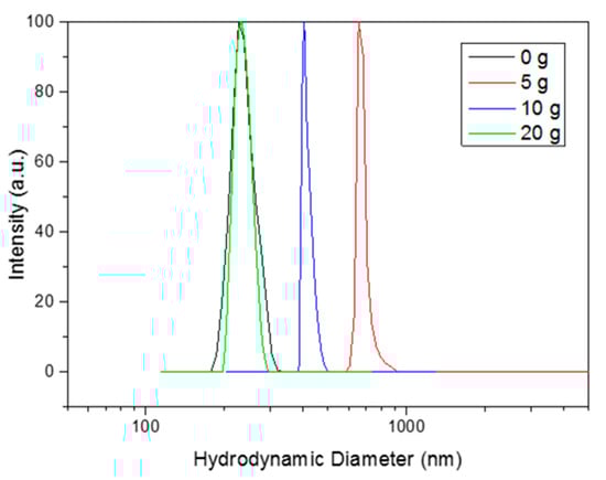 Figure 4. Hydrodynamic diameters (mode weighted in number of particles) of the synthesized materials measured by dynamic light scattering (DLS).