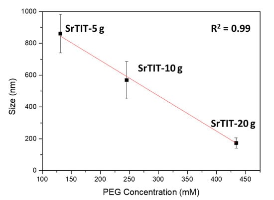 The materials were also analyzed by means of DLS to obtain further information on particle size and aggregation/agglomeration processes. Figure 4 highlights the PEG effect on the hydrodynamic diameter of the materials, confirming the effect observed via electron microscopy: a low amount of PEG (5 g) largely increases the size of the particles, while further amounts gradually decrease the size back down to the initial value of the material synthesized without a capping agent. Furthermore, the 5 and 10 g batches provide a narrower particle size distribution than the 0 and 20 g batches. This finding agrees with the SEM observations. The DLS diameter for the materials with bigger sizes (SrTIT-5 g and SrTIT-10 g) seems to be underestimated in comparison to the TEM size. This could be explained by partial sedimentation of the biggest particles, even in the presence of quite stable suspensions.