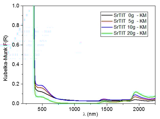 Figure 6 shows the UV–vis–NIR diffuse reflectance spectra of the synthesized materials. In the UV region, the spectra are dominated by the strong absorption ascribed to the band gap transition. Using a Tauc plot [32], an indirect band gap energy of about 3.2 eV can be derived for all the materials, in agreement with previously reported values [33]. Moreover, we can observe a tail in the absorption edge, extending down to 600 nm. A similar behavior has already been observed in SrTiO3 materials doped with nitrogen or containing oxygen vacancies [34]. However, in our case, this electronic absorption could likely be associated to the presence of traces of a lithiated phase [35] which has also been detected by XRD (see Section 2.1). Therefore, a contribution to the diffuse reflectance due to the small nanoparticles that present a defect in the amount of Sr should not be excluded.