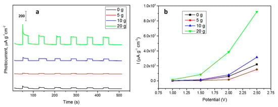 Figure 7. (a) Photocurrents measured for the synthesized materials at 1 V imposed and (b) trends of the photocurrents at the four imposed potentials (1, 1.5, 2 and 2.5 V).