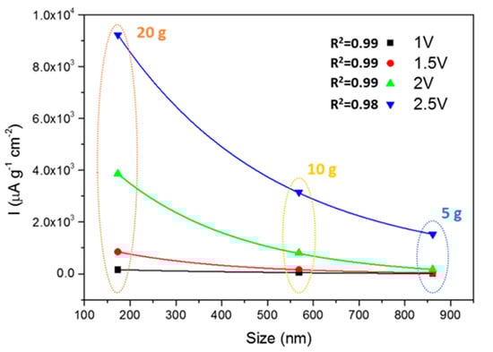 The photoactivities of the materials were evaluated by chronoamperometry measurements of the photocurrents (Ilight–Idark, Figure 7) at four different potentials (1, 1.5, 2 and 2.5 V; Figure 7). Again, there is a strong influence of both the size and shape of particles on the photoactivities. Considering the size first, and comparing the materials synthesized in the presence of PEG, it is possible to highlight an exponential-like decay of the photocurrent as the SMP size increases (Figure 8). The photocurrent can be improved in smaller semiconducting particles because the exciton generation occurs on average closer to the particle surface. This favors the surface trapping of minority carriers, whose diffusion length is usually critical, and the collection of majority carriers in the case of SrTiO3 electrons. This effect favors the development of larger photocurrents when smaller particles are involved. The results also highlight that the absorption due to the tail centered at 500 nm has a lower influence on the photocurrent production. In fact, the SrTIT-20 g absorption at 500 nm is the weakest, whereas its photocurrent is the largest. This means that only the UV region of the Xe lamp emission spectrum is able to produce the photocurrents.